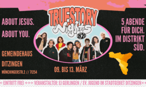 Wir haben keinen Bock auf eine Welt, in der oft nur Insta-Oberflächlichkeit zählt und man nach Aussehen und Leistung bewertet wird. Wir träumen von einer Welt, in der Liebe Hass besiegt. In der wir über unsere Ängste und Zweifel offen reden können, in… - +++ Heute KEIN Jugendkreis, verschoben auf Mittwoch +++In dieser Woche findet der Jugendkreis ausnahmsweise am MITTWOCH statt, da wir einen Ausflug zu einem Truestory Treffen in Ditzingen machen. Für genauere Infos einfach kurz direkt bei unserem Jugendreferenten Tim melden.